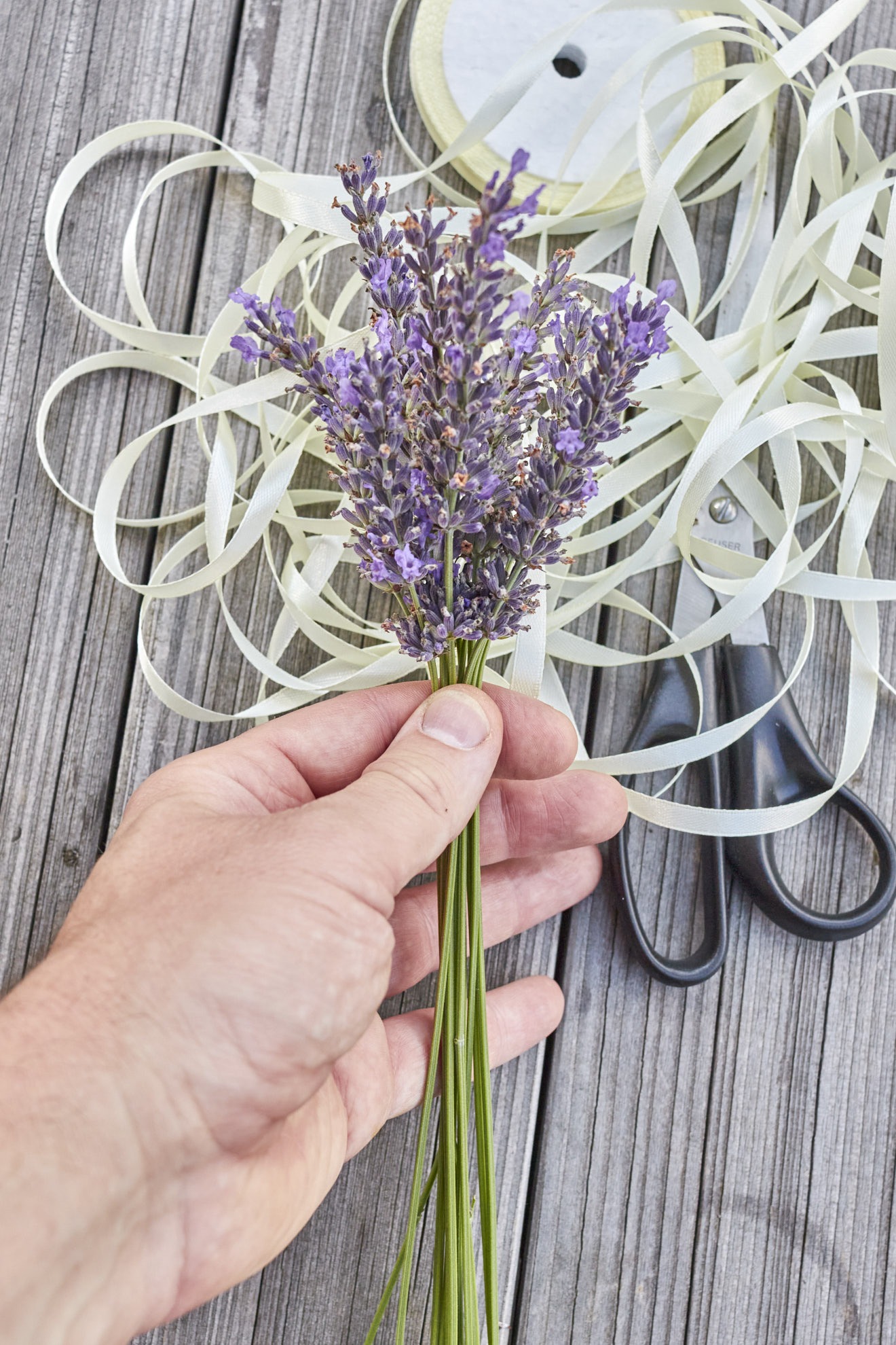 Jetzt werden noch die Stängel mit einer scharfen Gartenschere auf die endgültige Länge gekürzt – besonders schön, wenn man etwas schräg schneidet. Schon ist das erste Coeur de Lavande fertig!